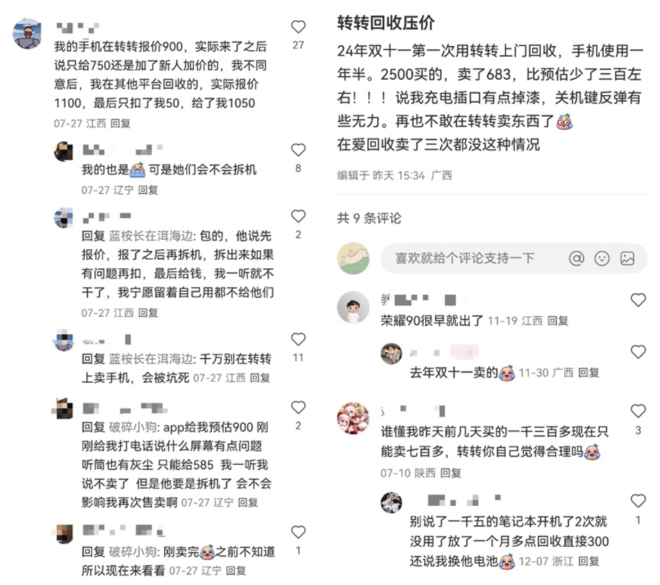 目前,市場上提供手機回收服務的渠道多樣,包括品牌官方、主流電商平臺以及專業二手回收平臺,但流程設計與用戶體驗差異顯著。以二手回收平臺轉轉為例,雖支持在線估價與線下門店回收,但不少用戶反饋,線上預估價與實際成交價常存在落差;即便完成寄送或到店,仍可能因“新增瑕疵”被進一步壓價。更有用戶表示,手機寄至檢測中心后,被單方面判定存在額外問題,導致回收價大幅縮水,而整個過程缺乏可驗證、可追溯的透明依據。
