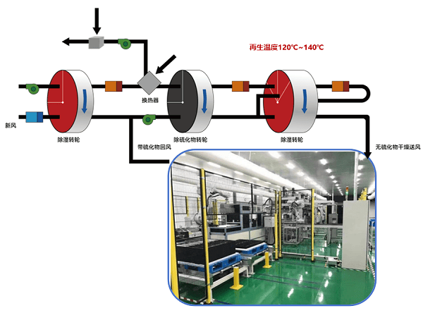 規模化生產中,除塵與除濕系統的除硫方案主要有三種:活性炭+金屬氧化物復合吸附、H2S吸附轉輪單獨應用或組合應用。經濟性對比顯示,活性炭方案初投資較低但運行成本高,轉輪方案初投資較高但維護成本低,長期運行更具優勢。具體選擇需根據產線規模、能耗要求及環保標準綜合評估。