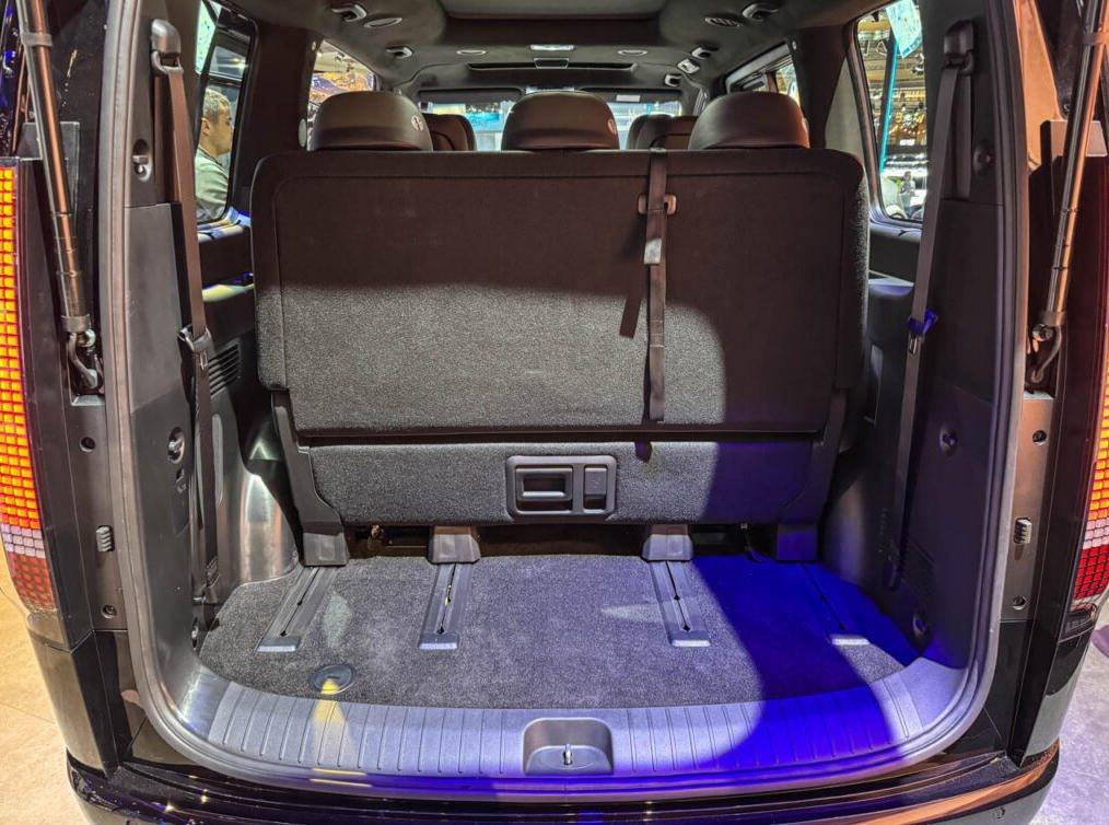 在空間布局上,STARIA電動版基于新的純電架構,實現了平整的地板設計。車身長度達5.25米,寬度為1.99米,軸距超過3.2米,提供7座和9座兩種座椅布局選擇。若選擇7座版本,第三排座椅后方的儲物空間可達1303升,足以滿足7人長途出行的行李存放需求。高車頂線條、雙側寬大滑門以及大型尾門開口的設計,均以功能性為導向,不僅增加了車內頭部空間,還方便了貨物的裝卸。