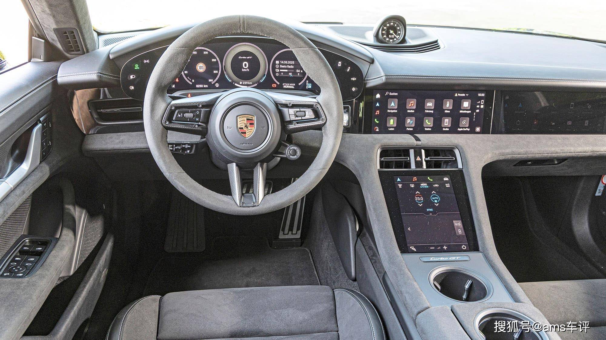 若將場景從直線賽道轉向蜿蜒鄉道,兩臺車的性格差異進一步凸顯。Lucid Air Sapphire的懸掛系統雖擁有較長的行程,但鋼制懸掛(Bilstein提供)與偏硬的自適應減震,在面對連續起伏路面時,仍需駕駛者保持專注。而Taycan Turbo GT憑借空氣懸掛、無防傾桿設計及獨立車輪控制系統,即便單側壓過路肩,車身依然穩如磐石,展現出德國工程對底盤動態的極致掌控。