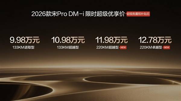 比亞迪近日推出2026款宋Pro DM-i 220km長續(xù)航版本,進(jìn)一步豐富其插混SUV產(chǎn)品線。此次上市的新車包含兩款配置,官方指導(dǎo)價(jià)區(qū)間為12.28萬至13.08萬元,疊加限時(shí)3000元購置稅補(bǔ)貼后,實(shí)際售價(jià)下探至11.98萬至12.78萬元。至此,該車系已形成133km與220km雙續(xù)航版本布局,全系在售車型增至四款,價(jià)格覆蓋9.98萬至12.78萬元區(qū)間。