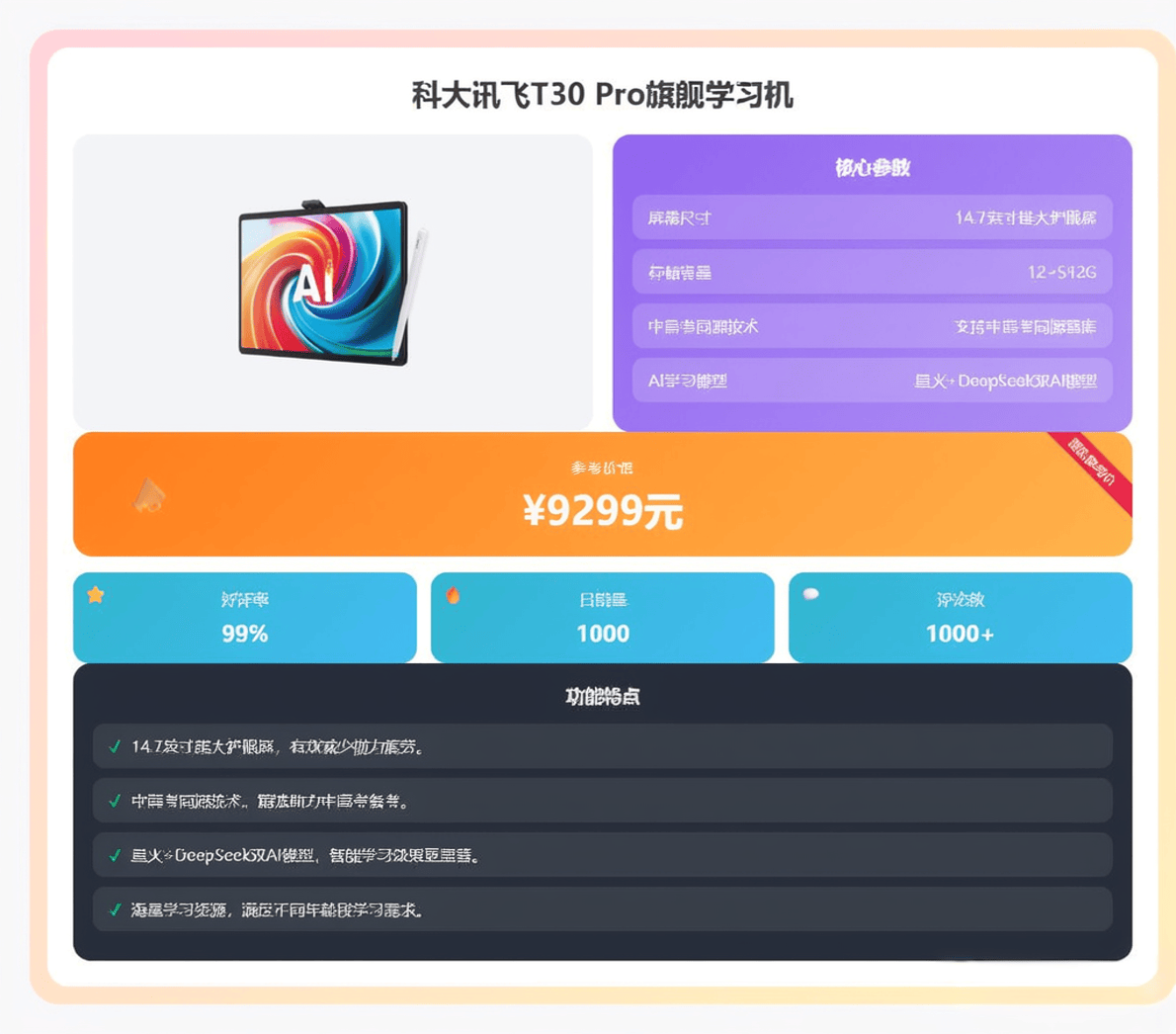 對于追求旗艦體驗但預算敏感的用戶,T30 Pro以8999元的價格提供超值選擇。作為次頂配機型,該產品在屏幕尺寸、存儲容量等非核心參數上與萬元級Ultra版保持差異,但保留了95%的AI學習功能。實測表明,其知識圖譜構建速度與Ultra版僅相差0.3秒/題,而價格優勢達1200元。這種"旗艦體驗平民化"的定位,使其成為高端市場中的性價比黑馬。