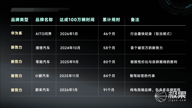 在新能源汽車行業(yè),“100萬輛”這一數(shù)字意義非凡,它不僅是銷量的體現(xiàn),更是品牌從“生存期”邁入“規(guī)模效益期”的關鍵門檻,堪稱企業(yè)發(fā)展的“成人禮”。回顧過往,能夠突破百萬銷量大關的新勢力品牌寥寥無幾,且各品牌達成這一里程碑所耗費的時間差異巨大。而AITO問界在2026年1月達成這一目標,累計用時僅46個月,刷新了行業(yè)最快紀錄。