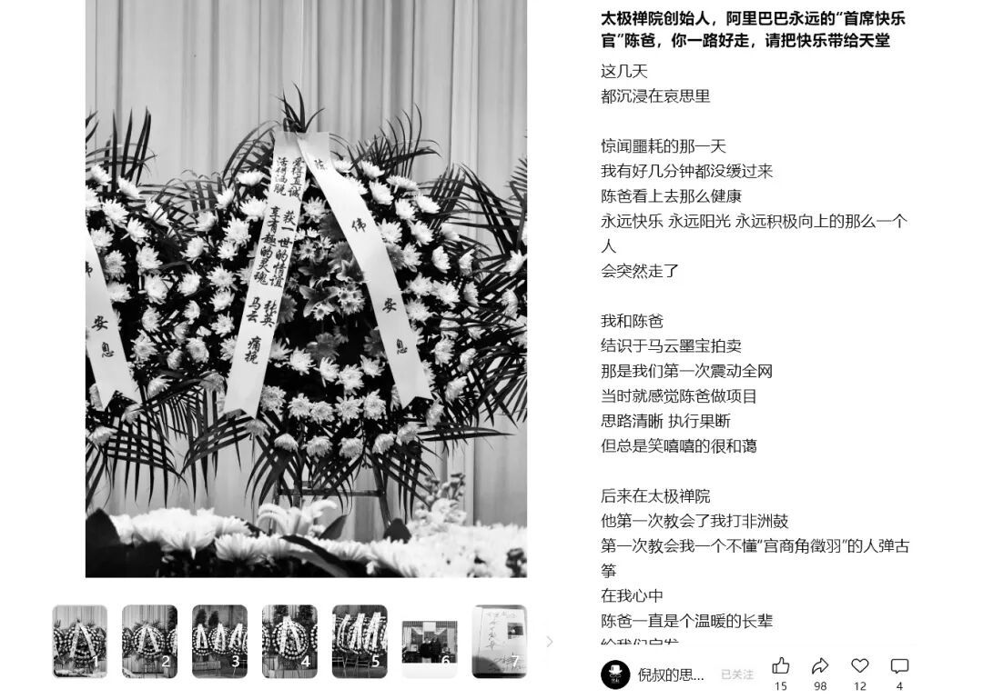 近日,電商領域知名人士倪叔透露了一則令人惋惜的消息:阿里巴巴太極禪院創始人、馬云前助理陳偉已離世。據倪叔描述,在陳偉的告別儀式上,馬云夫婦特意送上了花圈以表哀思。