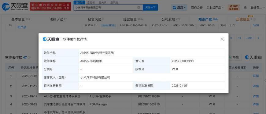 據公開知識產權信息披露,小米汽車科技有限公司近期完成了一項重要軟件著作權的登記工作,該軟件被命名為“AI小蘇-智能診斷專家系統”,登記版本為V1.0。這一舉措標志著小米在汽車智能化領域邁出了新的步伐。