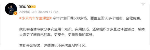 小米汽車近日宣布,將于今年在全國范圍內推出超過600場免費車主課堂活動,覆蓋50多個城市,旨在提升車主的用車體驗和駕駛安全。這一舉措由小米創辦人、董事長兼CEO雷軍通過微博正式對外公布。