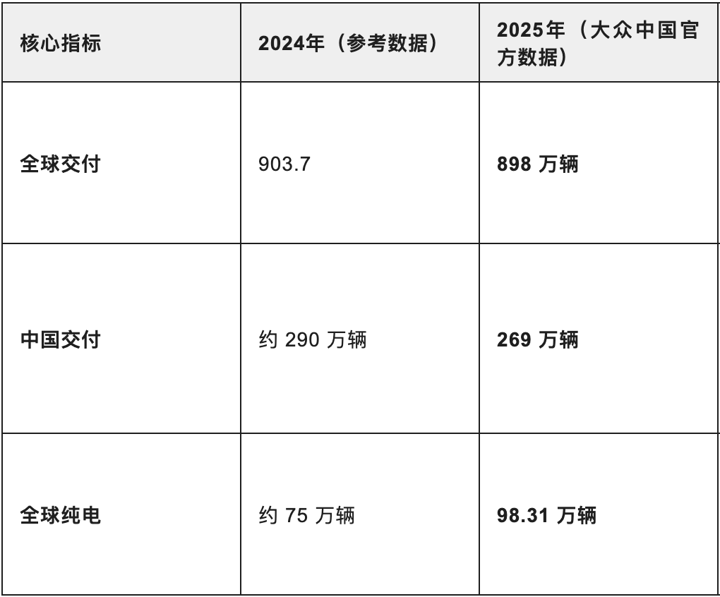 盡管全球排名暫居次席,大眾在新能源汽車領域展現出強勁增長勢頭。2025年,其純電動汽車交付量達98.31萬輛,同比增長32%,在集團總銷量中的占比提升至10.9%,較上年增加2.7個百分點。這一數據表明,大眾在電動化轉型中已取得階段性成果,為未來競爭奠定了技術基礎。