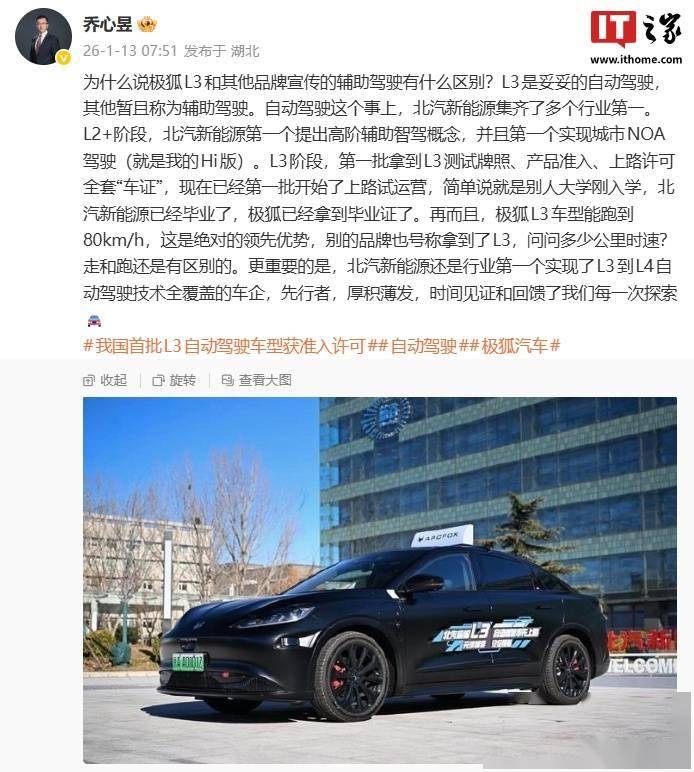 北汽新能源極狐品牌在自動駕駛領域邁出關鍵一步,其L3級自動駕駛技術已進入規模化運營階段。用戶運營中心副總經理喬心昱公開表示,極狐L3與市面上其他品牌宣傳的輔助駕駛存在本質差異,前者已實現真正的自動駕駛功能,而后者仍屬于輔助駕駛范疇。