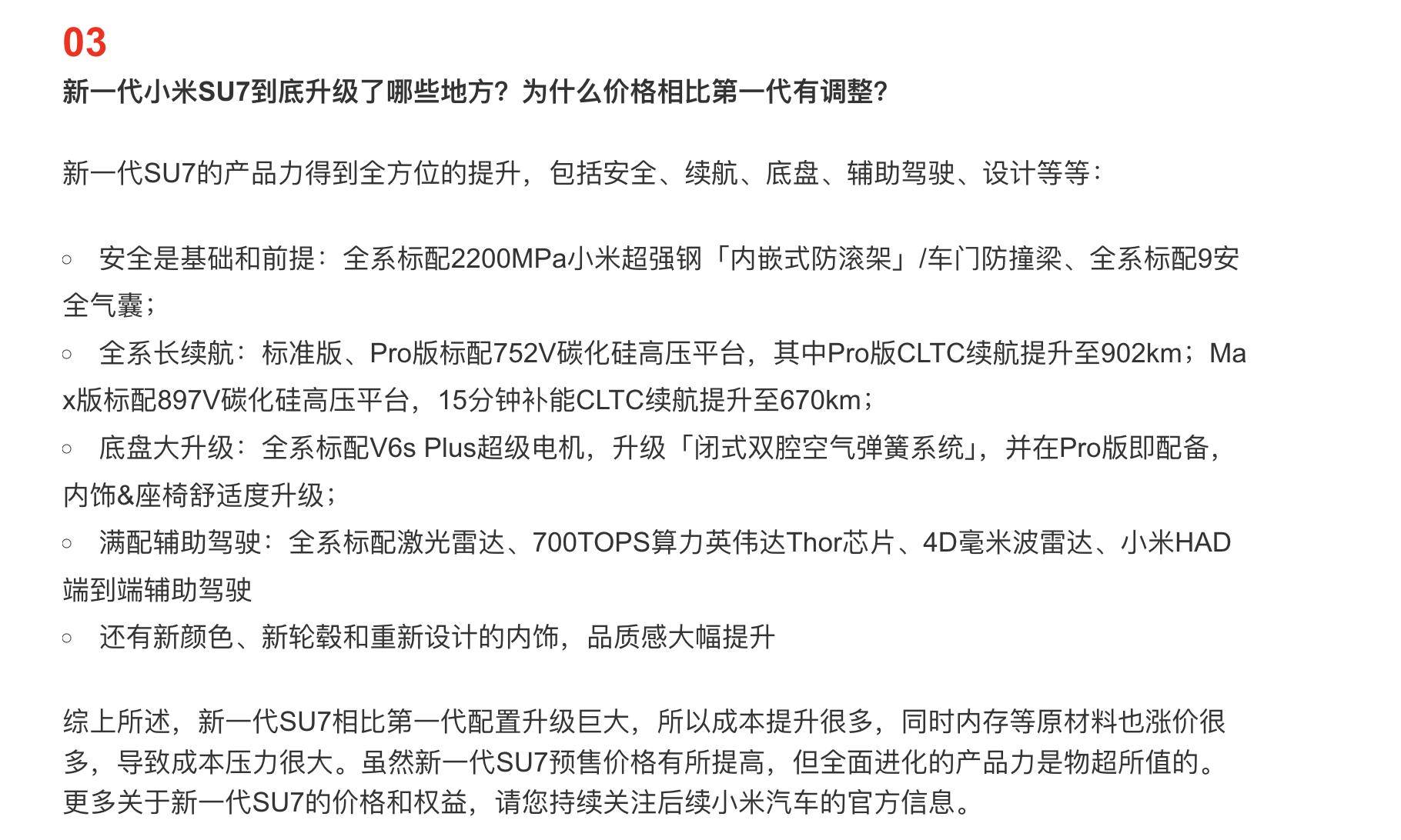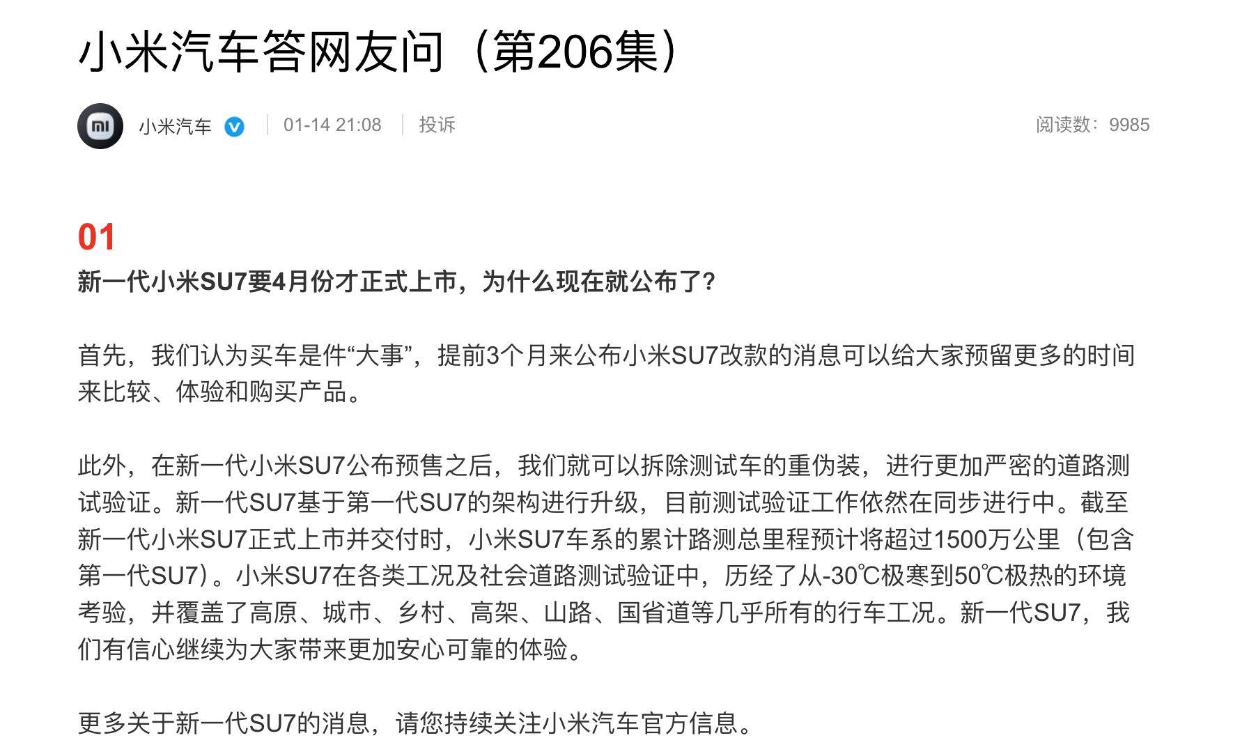小米汽車近日通過官方渠道回應了網友關于新一代SU7的多個疑問,其中最受關注的是新車上市時間提前公布的原因。官方解釋稱,汽車消費決策周期較長,提前三個月披露改款信息旨在為消費者預留充足的比較、試駕和購買準備時間。這一策略不僅體現了對用戶需求的重視,也為后續市場推廣預留了緩沖期。
