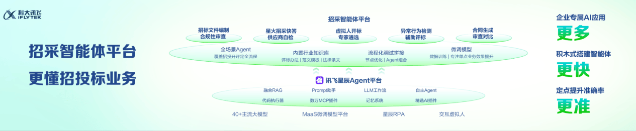 技術演進路徑顯示,招采領域AI應用歷經三個階段:初期通過小模型實現文檔結構化處理,解決人工檢索效率問題;中期借助大模型突破認知瓶頸,實現評審規(guī)則的智能解析;當前進入智能體時代,具備自主規(guī)劃能力的AI系統開始主導全流程協同。科大訊飛此次發(fā)布的平臺整合了決策規(guī)劃、自動化執(zhí)行與模型精調三大能力,其中星辰Agent底座創(chuàng)新性融合大模型推理與RPA技術,形成"思考-決策-執(zhí)行"的完整閉環(huán)。
