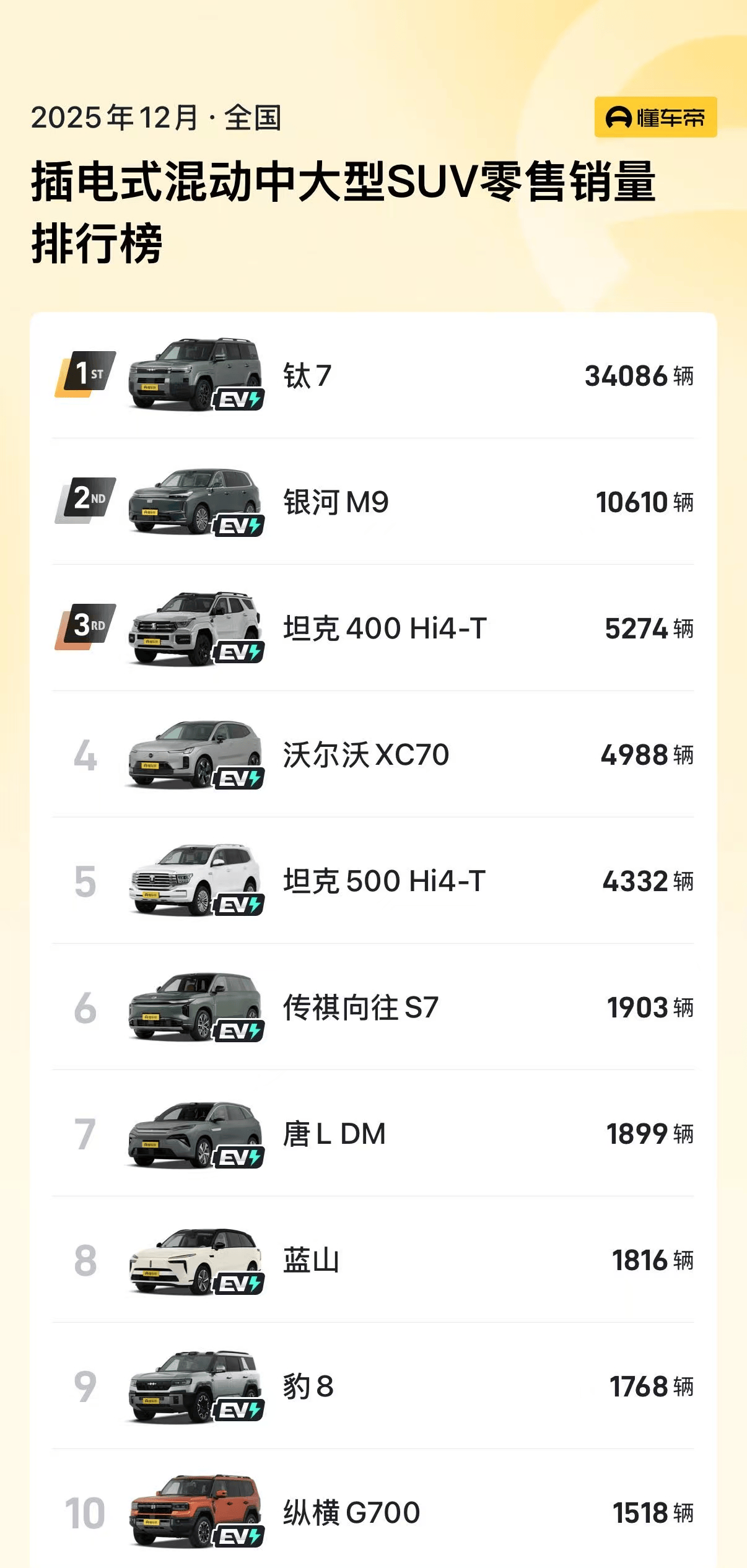 在主流大六座SUV市場,吉利銀河M9正以強勁勢頭掀起熱潮。最新銷量數據顯示,這款定位AI科技大六座的旗艦SUV,12月單月銷量突破10610輛,穩居中大型SUV細分市場銷量排行榜第二位。至此,該車型已連續三個月保持月銷破萬的優異表現,成為20萬級SUV市場中備受消費者青睞的熱門選擇。