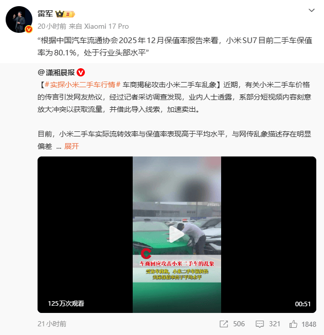 針對(duì)市場傳聞,小米官方迅速作出回應(yīng)。1月13日,小米科技創(chuàng)始人雷軍通過微博辟謠“小米二手車無人問津”的說法,強(qiáng)調(diào)相關(guān)報(bào)道與事實(shí)不符。小米公關(guān)團(tuán)隊(duì)同步轉(zhuǎn)發(fā)行業(yè)分析文章,呼吁公眾理性看待市場波動(dòng)。值得注意的是,中國汽車流通協(xié)會(huì)的報(bào)告顯示,盡管短期價(jià)格承壓,但小米SU7的保值率仍優(yōu)于多數(shù)同級(jí)競品,其市場認(rèn)可度未因短期波動(dòng)出現(xiàn)根本性動(dòng)搖。