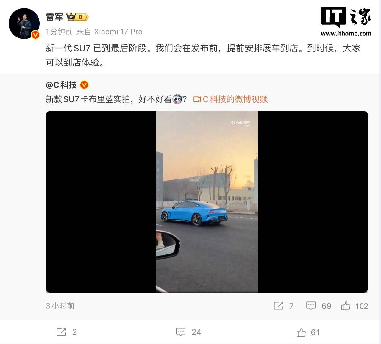 小米集團董事長兼CEO雷軍今日通過微博宣布,新一代SU7車型已進入量產前最后準備階段。為方便消費者提前體驗,小米汽車將在正式發布前啟動全國展車巡展計劃,用戶可前往指定門店近距離感受新車魅力。