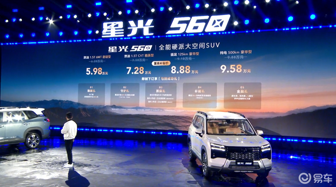 星光560共推出4款車型,置換補貼后售價區間為5.98萬至9.58萬元。更令人心動的是,在2月15日前購車,消費者還可享受1000元抵2000元的優惠。作為一款家用SUV,星光560不僅價格親民,更在動力配置上大膽創新,提供燃油、插混和純電三種動力選擇,滿足不同消費者的需求。