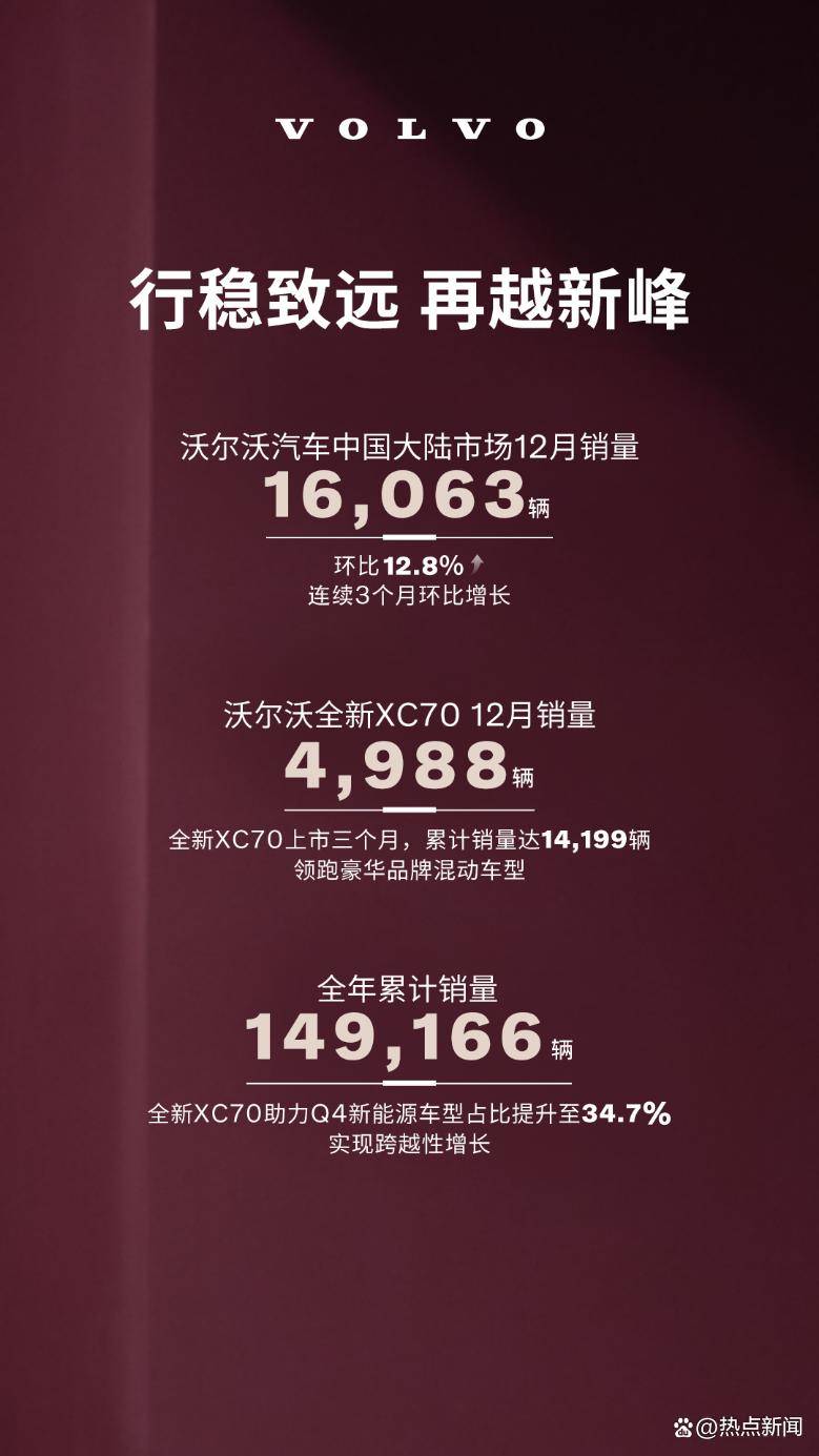 在豪華汽車市場競爭愈發白熱化的當下,沃爾沃汽車在中國大陸市場交出了一份令人矚目的答卷。單月銷量達16,063輛,環比增長12.8%,全年累計銷量突破149,166輛。這一成績并非依靠短期營銷手段,而是長期戰略布局的成果體現,在理性消費主導的市場環境中顯得尤為珍貴。