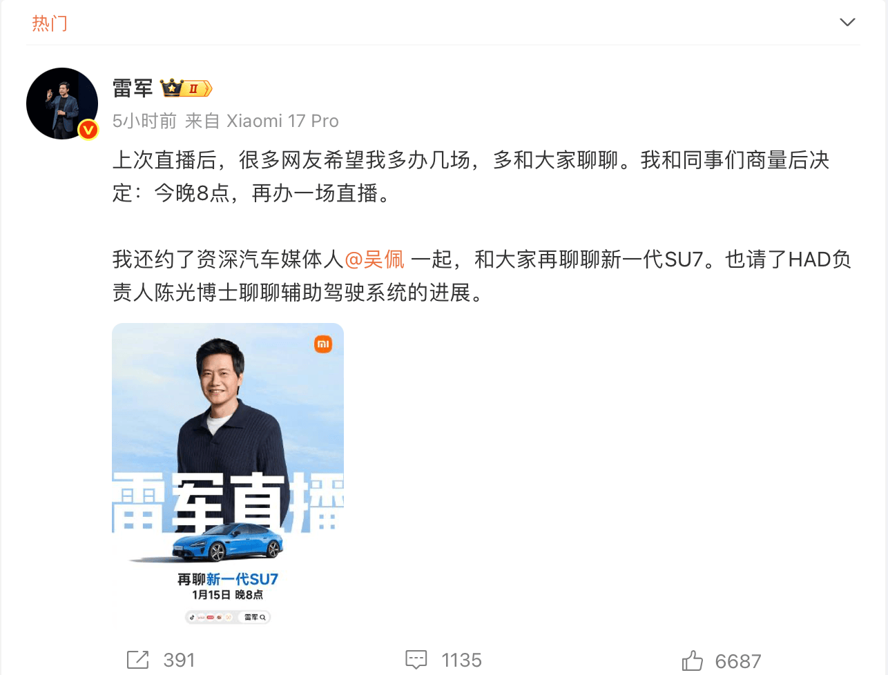 據(jù)悉,此次直播是雷軍2026年以來開展的第三場公開直播。此前,他在1月3日的直播中帶領(lǐng)工程師團隊拆解小米汽車,直接回應(yīng)產(chǎn)品質(zhì)疑,峰值觀看人數(shù)突破千萬;1月7日的直播中,他首次詳細解讀新一代小米SU7,公布該車22.99萬元起的預(yù)售價格及全系標(biāo)配激光雷達等核心配置信息,并針對漲價、營銷爭議等輿論熱點進行回應(yīng)。