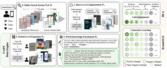 當平臺現有的內容庫或日志無法覆蓋某些長尾、復雜查詢時,CroPS 引入大語言模型(LLM)作為虛擬檢索器和內容生成器,利用 One-shot Prompting 策略生成高質量合成樣本,將外部世界的常識與邏輯蒸餾進檢索模型中。
