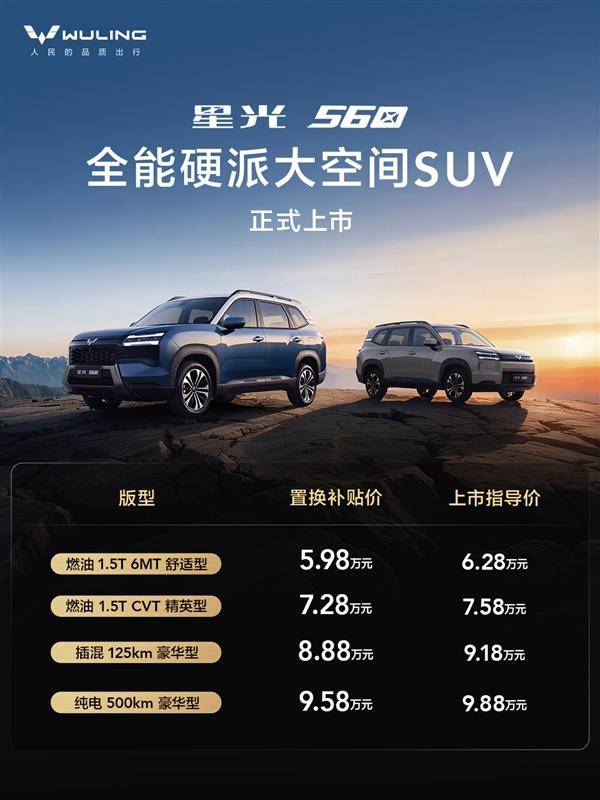 五菱汽車近日正式推出全新車型——星光560,這款定位為“全能硬派大空間SUV”的新車共提供4款配置選擇,動力系統覆蓋燃油、插電混動和純電動三種版本,官方指導價區間為6.28萬元至9.88萬元,置換補貼后價格下探至5.98萬元起。作為同級別市場中少有的三動力布局車型,其定價策略直接對標本田飛度等合資兩廂車,形成差異化競爭態勢。