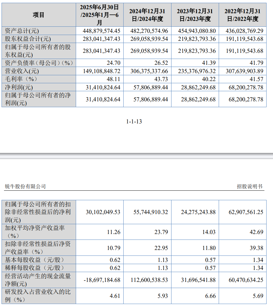 從財務數據來看,報告期內(2022年至2025年上半年),銳牛股份的營業收入呈現出一定的波動。2022年營業收入為3.08億元,2023年降至2.35億元,2024年回升至3.06億元,2025年上半年則為1.49億元。凈利潤方面,2022年為6820.03萬元,2023年下降至2886.22萬元,2024年又回升到5780.69萬元,2025年上半年為3141.08萬元。