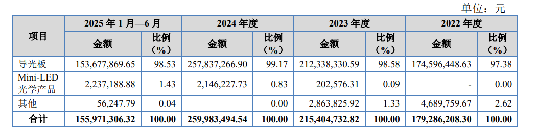 根據(jù)招股書披露,元立光電的主營業(yè)務收入呈現(xiàn)多元化結構。導光板產品作為傳統(tǒng)優(yōu)勢領域持續(xù)貢獻穩(wěn)定收益,而Mini-LED光學產品憑借技術迭代優(yōu)勢,收入占比呈現(xiàn)快速上升態(tài)勢。公司通過優(yōu)化生產工藝與供應鏈管理,有效控制了原材料成本波動帶來的影響。