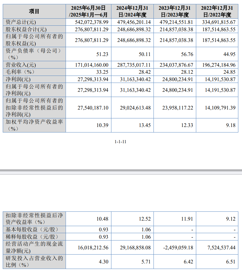 財務數(shù)據(jù)顯示,2022年至2025年上半年期間,元立光電保持穩(wěn)健增長態(tài)勢。報告期內營業(yè)收入分別為1.96億元、2.34億元、2.88億元及2025年上半年的1.71億元;同期凈利潤達1419.15萬元、2480.02萬元、3116.33萬元,2025年上半年已實現(xiàn)2729.83萬元,盈利能力呈現(xiàn)逐年提升趨勢。