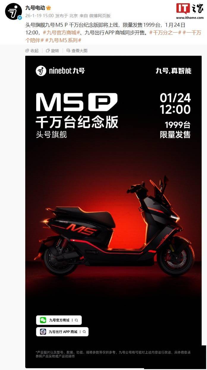九號電動近日宣布,備受矚目的頭號旗艦車型——九號 M5 P 千萬臺紀念版即將正式登場。這款限量版車型將于1月24日12:00開啟發售,全球僅限量1999臺,具體售價尚未對外公布。