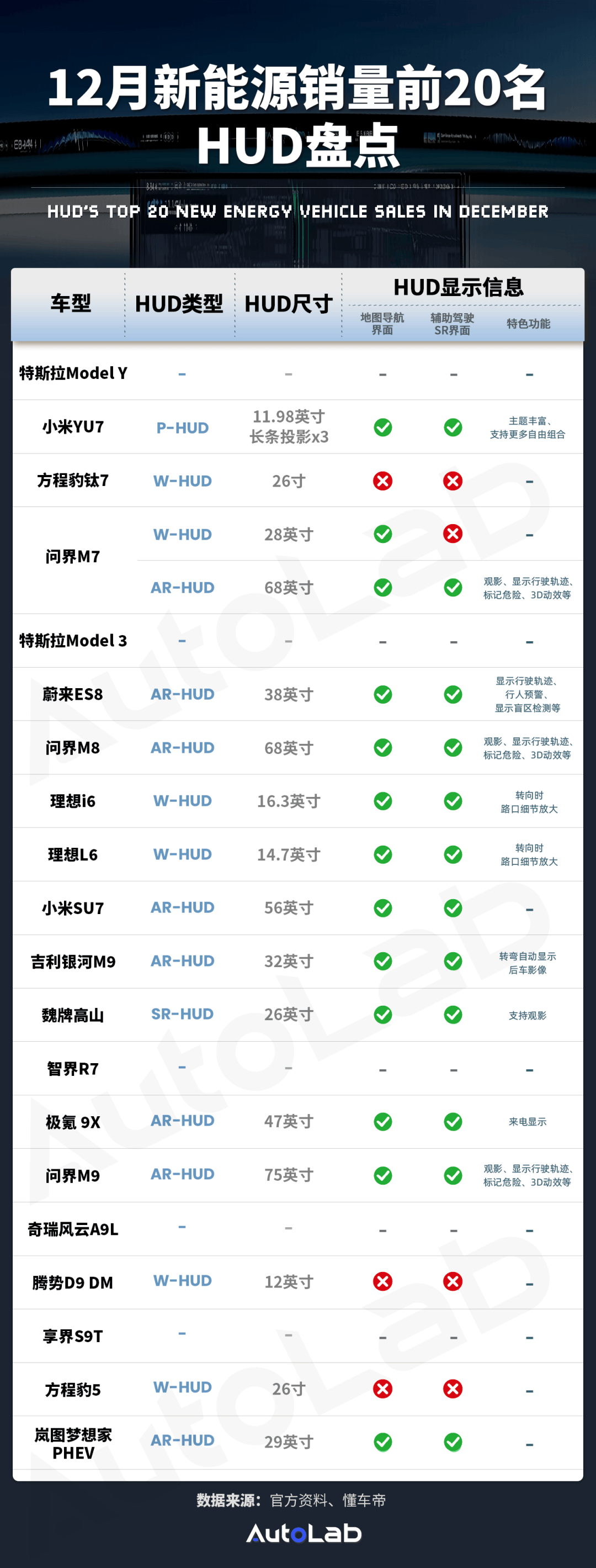 以去年12月新能源車銷量前20名的車型為例,HUD技術已呈現(xiàn)出多樣化的特點。AR-HUD(增強現(xiàn)實抬頭顯示系統(tǒng))如今愈發(fā)常見,許多高端新能源車型都將其作為標配。AR-HUD不僅能夠將導航內容與實際路況精準結合,還具備比W-HUD更遠的成像距離和更大的成像面積。例如問界M9、蔚來ES8等車型,其AR-HUD可將光影與路面完美重合,生動呈現(xiàn)車輛的行駛軌跡,為駕駛者提供更為直觀的導航體驗。