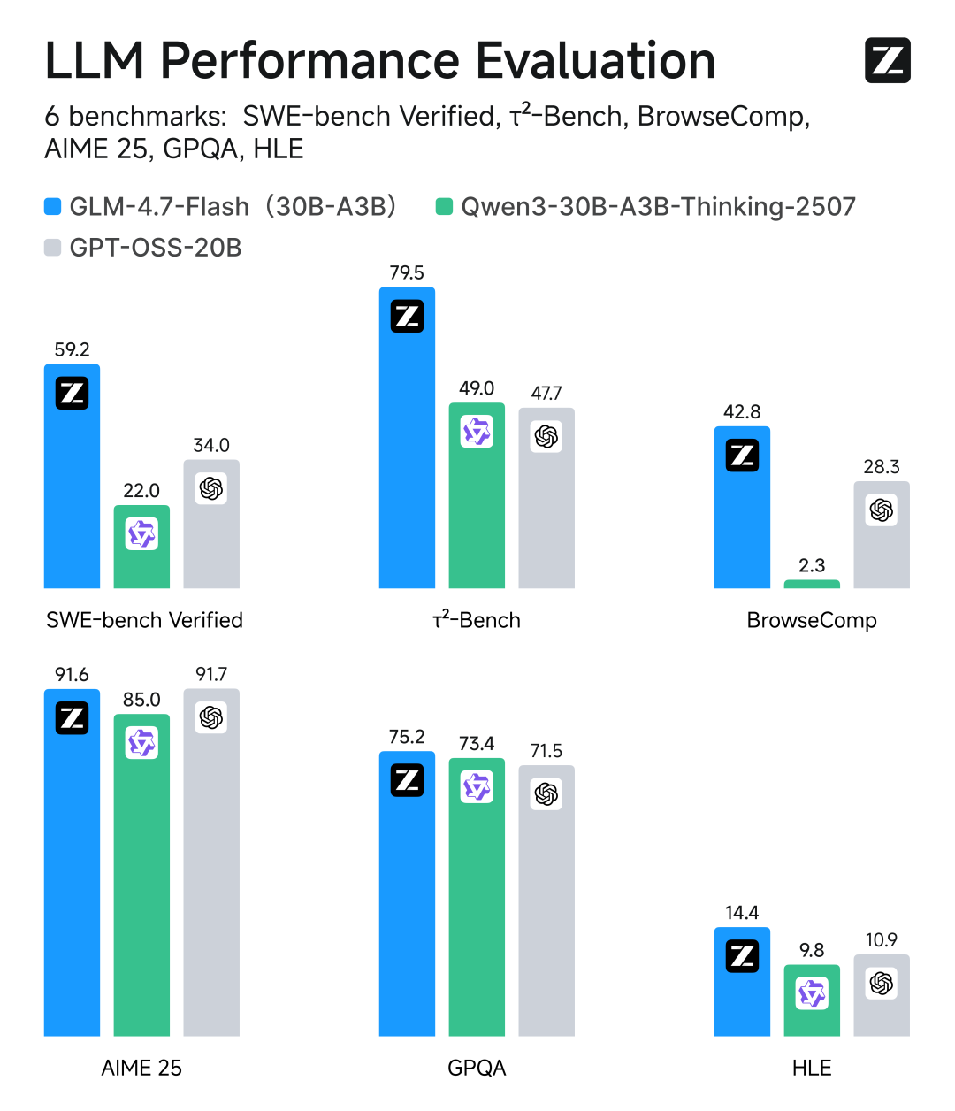 在性能表現方面,GLM-4.7-Flash在主流基準測試中成績斐然。在SWE-bench Verified、τ2-Bench等測試中,其綜合表現超越了gpt-oss-20b、Qwen3-30B-A3B-Thinking-2507等模型,在相同和近似尺寸模型系列中斬獲開源SOTA分數,充分彰顯了該模型的強大實力。