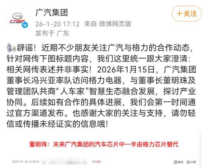 針對這一網(wǎng)傳消息,廣汽集團迅速通過官方微博發(fā)文辟謠。廣汽集團表示,1月15日的訪問主要是為了共商“人車家”智慧生態(tài)融合發(fā)展,探討產(chǎn)業(yè)協(xié)同的可能性。雙方在交流中并未涉及芯片合作的具體事宜。同時,廣汽集團還透露,如果與格力電器在相關領域有具體合作進展,將會第一時間通過官方渠道進行發(fā)布。