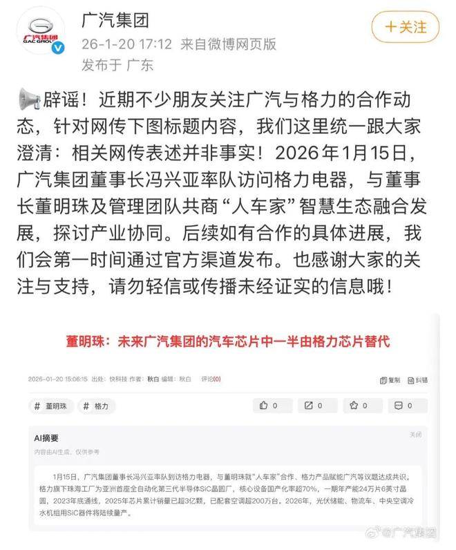 近日,一則關于廣汽集團與格力電器合作的市場傳聞引發廣泛關注。有消息稱,1月15日廣汽集團董事長馮興亞率隊訪問格力電器時,格力電器董事長董明珠表示未來廣汽汽車芯片將有一半由格力產品替代。該消息迅速在各大網絡平臺傳播,引起市場熱議。
