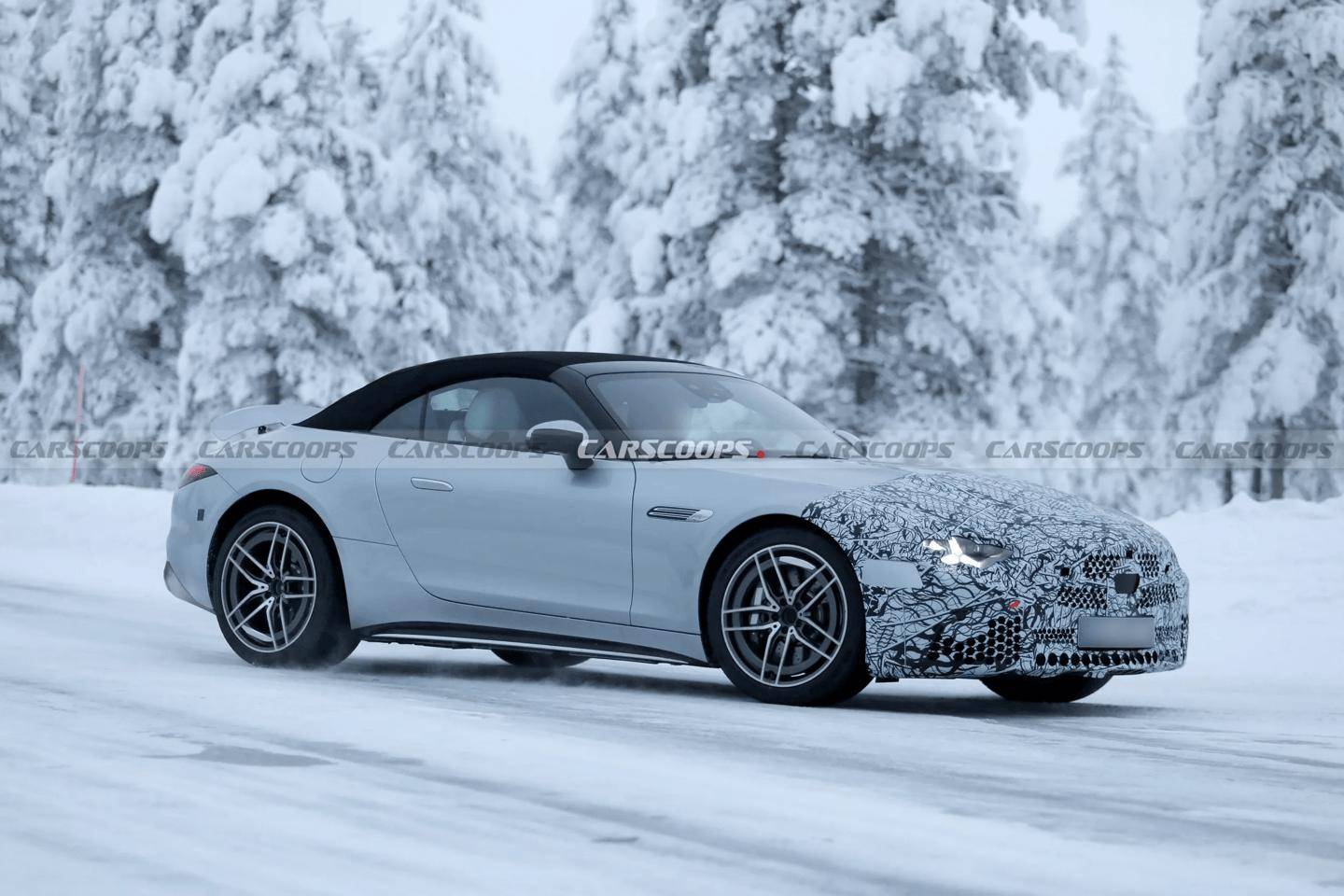 汽車媒體CarScoops近日披露了一組梅賽德斯-AMG SL中期改款車型的冬季路測諜照。這款自2021年秋季問世的高性能跑車,經過近四年市場檢驗后,即將迎來首次重大升級。測試車在極寒環境下展現出全新設計語言,前臉偽裝雖厚重,但標志性三叉星徽大燈依然清晰可辨。