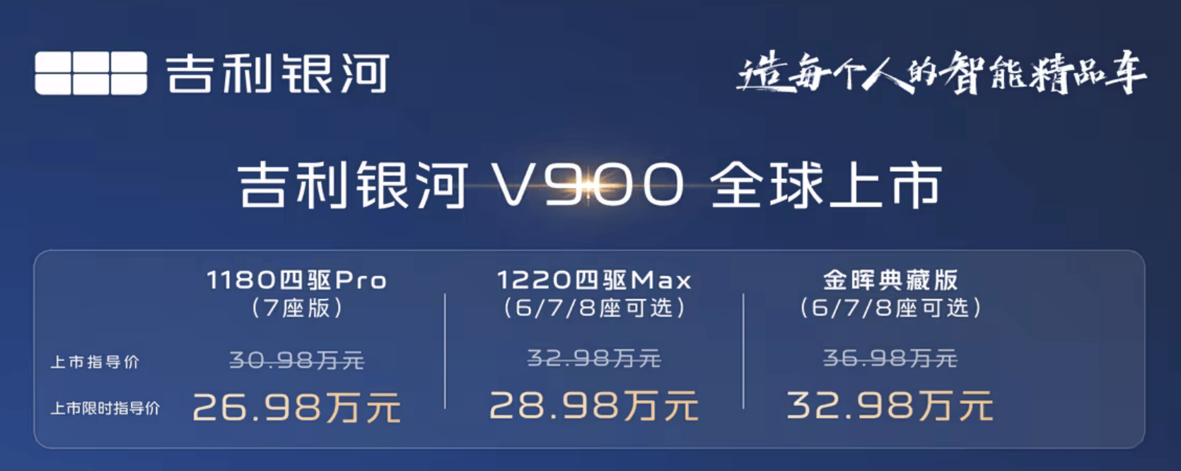 吉利銀河V900近日正式登場,標志著吉利銀河在豪華MPV領域邁出重要一步。這款新車共推出三款配置,限時指導價區(qū)間為26.98萬元至32.98萬元,較預售階段下調5萬元,展現(xiàn)出極強的市場競爭力。其直接對標別克GL8、嵐圖夢想家、騰勢D9等熱門車型,為消費者提供更具性價比的選擇。