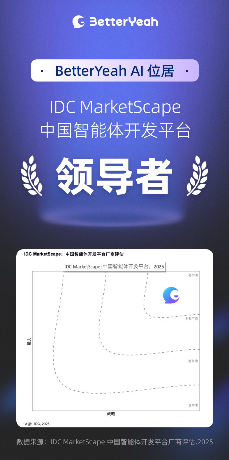 近日,國際權威咨詢機構 IDC 發布《IDC MarketScape: 中國智能體開發平臺 2025 年廠商評估》(2025年12月)報告。國內領先的 AI 技術廠商 BetterYeah AI 憑借其在技術架構完整性、平臺成熟度、企業級安全及行業落地能力等維度的卓越表現,位居「領導者」類別。