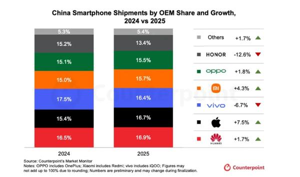 Counterpoint數據顯示,2025年中國市場前五大手機廠商分別為華為(16.9%)、蘋果(16.7%)、vivo(16.4%)、小米(15.7%)和OPPO(15.5%)。榮耀以13.4%的市占率位列第六,出貨量同比下滑12.6%。盡管國內市場表現低迷,但榮耀在海外市場的增速卻領跑行業,全年海外出貨量同比增長47%,業務占比首次突破50%。