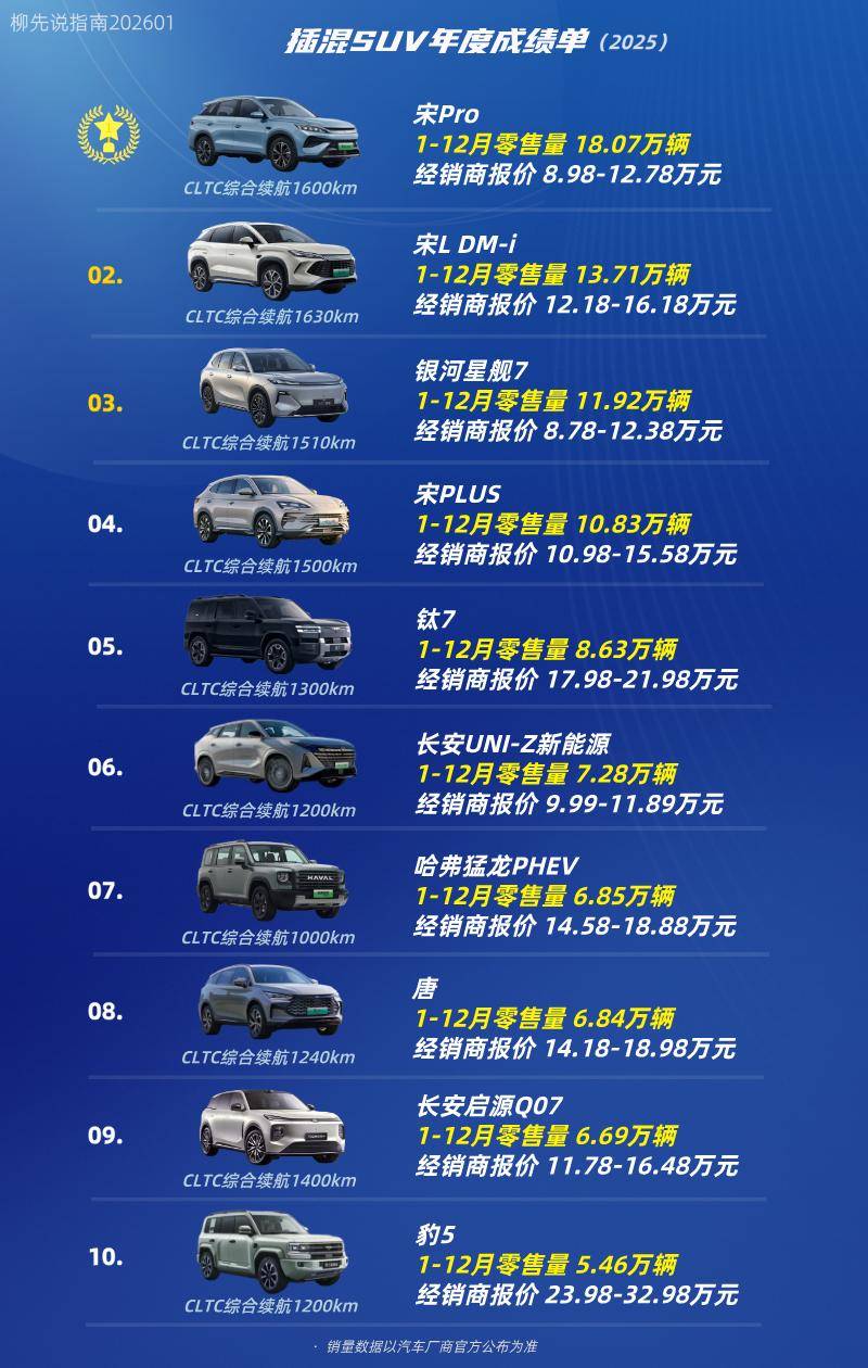 過去一年,插電式混合動力SUV市場成績斐然。在年度銷量6-10名的榜單中,長安UNI-Z新能源以7.28萬臺的年累計零售量位列第6,綜合續(xù)航里程達1200km;哈弗猛龍PHEV、唐、長安啟源Q07以及豹5也躋身該榜單。而在1-5名的榜單中,比亞迪宋Pro以18.07萬臺的年零售量位居榜首,綜合續(xù)航1600km,截至2026年1月,其累計銷量已突破100萬臺。