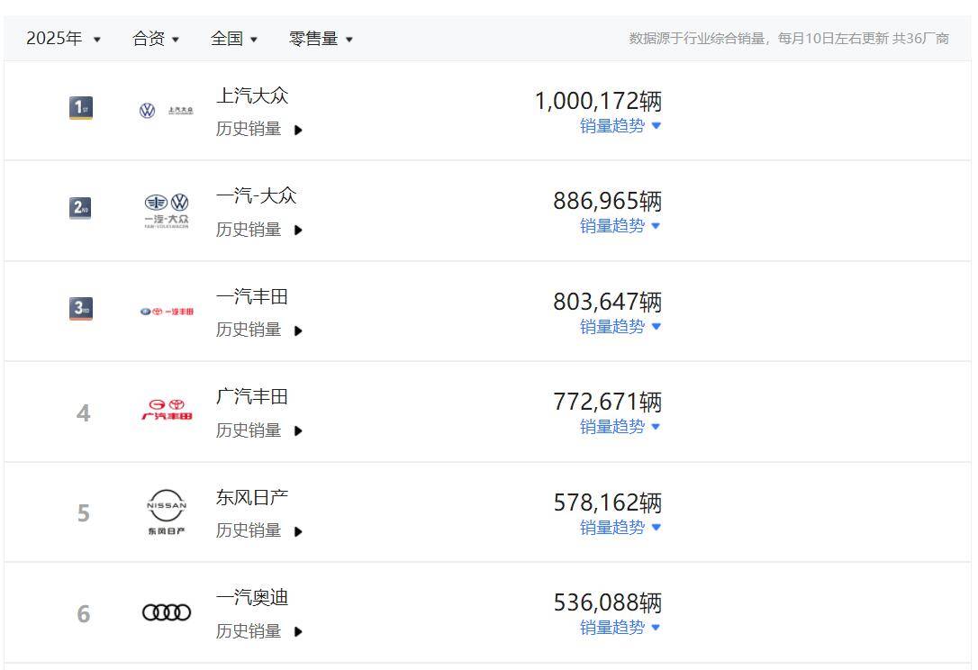 市場格局呈現(xiàn)明顯分化特征。頭部陣營中,上汽大眾以100萬輛年銷量持續(xù)領(lǐng)跑合資陣營,其產(chǎn)品矩陣覆蓋朗逸、帕薩特等傳統(tǒng)燃油爆款與ID.3等新能源車型,形成燃油與電動(dòng)雙輪驅(qū)動(dòng)格局。一汽-大眾與一汽豐田分列二三位,年銷量均突破80萬輛,速騰、RAV4榮放等主力車型在細(xì)分市場保持較強(qiáng)競爭力。值得關(guān)注的是,豪華品牌陣營轉(zhuǎn)型步伐加快,一汽奧迪與華晨寶馬年銷量雙雙突破53萬輛,通過加速本土化研發(fā)與純電車型投放,在高端新能源市場占據(jù)一席之地。