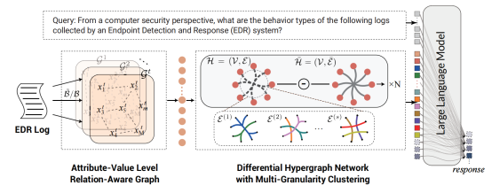為此,360研究團隊創新地將超圖推理與大語言模型相結合,提出HyperGLLM框架。該框架首先構建屬性-值的關系圖,以捕捉低階結構語義并減少文本冗余;隨后,引入集成多粒度聚類的微分超圖模塊,用于捕捉交錯事件中的高階行為依賴關系;將超圖增強的語義表示與大語言模型對齊,從而實現對潛在惡意行為的高效上下文推理。