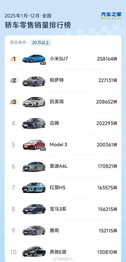 在最新公布的2025年國內20萬元及以上轎車市場銷量榜單中,小米汽車旗下首款車型SU7以絕對優勢登頂年度銷量冠軍。這款新能源轎車全年累計零售銷量達258164輛,不僅超越了傳統燃油車領域的德系、日系勁旅,更在新能源賽道上展現出強勁競爭力。