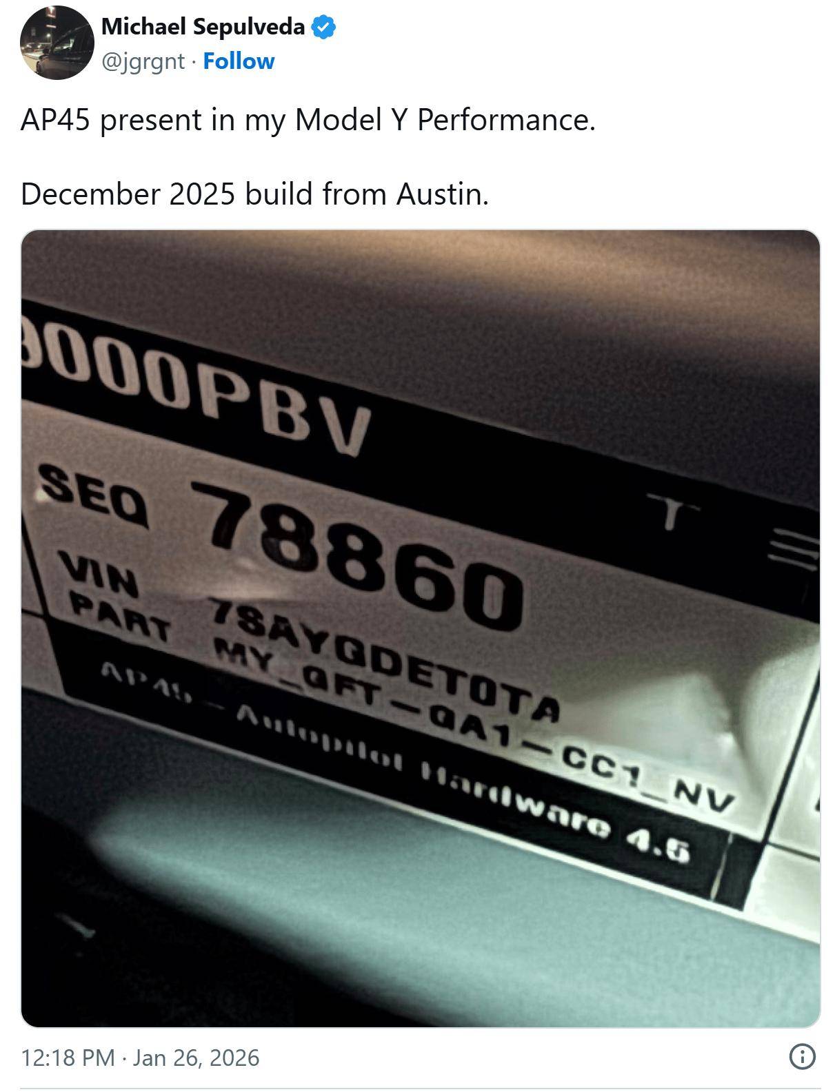 車主@Eric5un在社交平臺發文稱,其購買的弗里蒙特工廠生產的2026款Model Y全輪驅動Premium版,不僅配備了16英寸中控屏,更在手套箱下方發現了型號為“AP45”的輔助駕駛計算機,零件編號為“2261336-02-A”。無獨有偶,另一位Model Y性能版車主表示,其2025年12月生產的車輛同樣在手套箱內帶有“AP45-Autopilot Hardware 4.5”標識。來自奧斯汀工廠的Model Y性能版車主@Michael Sepulveda也分享了類似發現,進一步佐證了這一硬件的普及性。