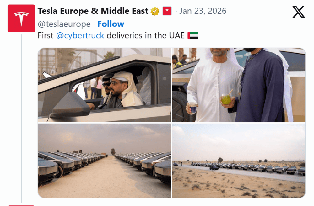 除了歐洲市場的深耕,特斯拉在中東地區也取得了重要進展。在阿拉伯聯合酋長國,特斯拉完成了Cybertruck的首批交付,標志著這一車型正式進入中東市場。Cybertruck的交付在當地電動汽車用戶群體中引發了強烈反響,進一步鞏固了特斯拉在全球市場的地位。