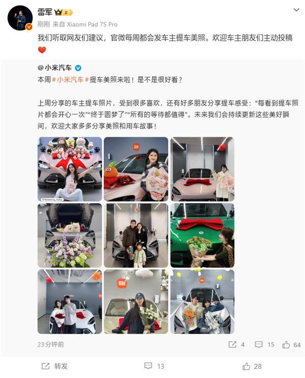 近日,小米汽車官方微博開啟了一項新活動——每周發布車主提車美照,分享購車喜悅。這一創意源于網友建議,小米創始人雷軍在社交平臺透露,官微將定期展示車主風采,同時歡迎車主主動投稿參與。