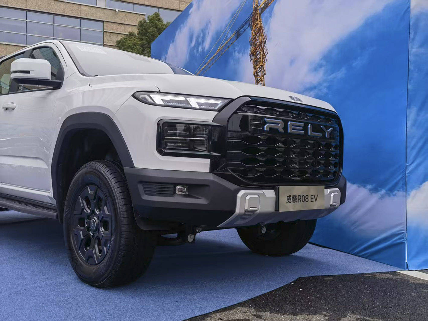 在外觀設計上,威麟R08 EV延續了家族標志性的“麒麟力量美學”理念。前臉采用鱗甲造型的超大尺寸進氣格柵,搭配分體式“麒麟瞳”LED大燈組,形成極具辨識度的視覺效果。與傳統新能源車型不同,新車未采用封閉式前臉設計,而是在RELY英文標識處運用藍色鍍鉻裝飾,既保持了品牌特征,又凸顯新能源身份。車身側面通過265mm寬胎與高離地間隙設計,強化了越野氣質。