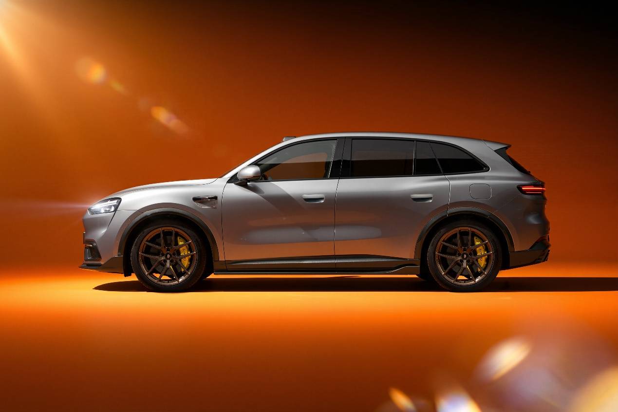 問界M6的側面設計同樣亮點十足。從前臉自然延伸至側面的黑色包圍元素,使整車的離地間隙顯得更低,營造出一種低趴的運動姿態。官方圖片顯示,問界M6提供了兩種不同樣式的輪胎選擇。一種采用大輪圈和小扁平比的設計,輪圈為細輻條樣式,疑似為鍛造輪圈,但尚未得到官方確認;另一種輪胎規格的扁平比稍大,采用五輻式設計,同樣具有不錯的運動視覺效果。前后輪內部均配備了大尺寸的亮色定鉗,不僅提升了視覺效果,還對車輛的駕控性能有所幫助。不同輪圈形式下,卡鉗的布置位置也有所不同,這讓人猜測問界M6可能會推出專屬的高性能運動套件供消費者選配。