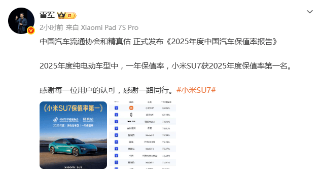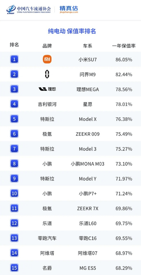 中國汽車流通協會聯合精真估最新發布的《2025年度中國汽車保值率報告》顯示,在純電動車型一年保值率榜單中,小米SU7以顯著優勢登頂榜首,問界M9與理想MEGA分列第二、第三位。