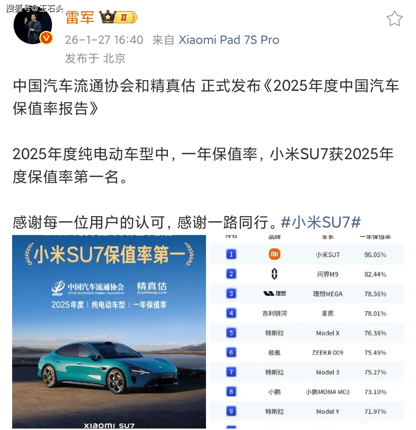 近日,中國汽車流通協會發布的一份權威報告引發行業熱議——小米SU7以純電轎車品類第一的成績登頂保值率榜單,這一數據直接擊碎了此前部分自媒體關于“小米二手車價格崩盤”的謠言。報告顯示,在新能源車市場快速迭代的背景下,小米SU7上市近兩年仍保持80%以上的保值率,甚至超越特斯拉Model 3等傳統標桿車型,成為國產新能源品牌突破高端市場的典型案例。