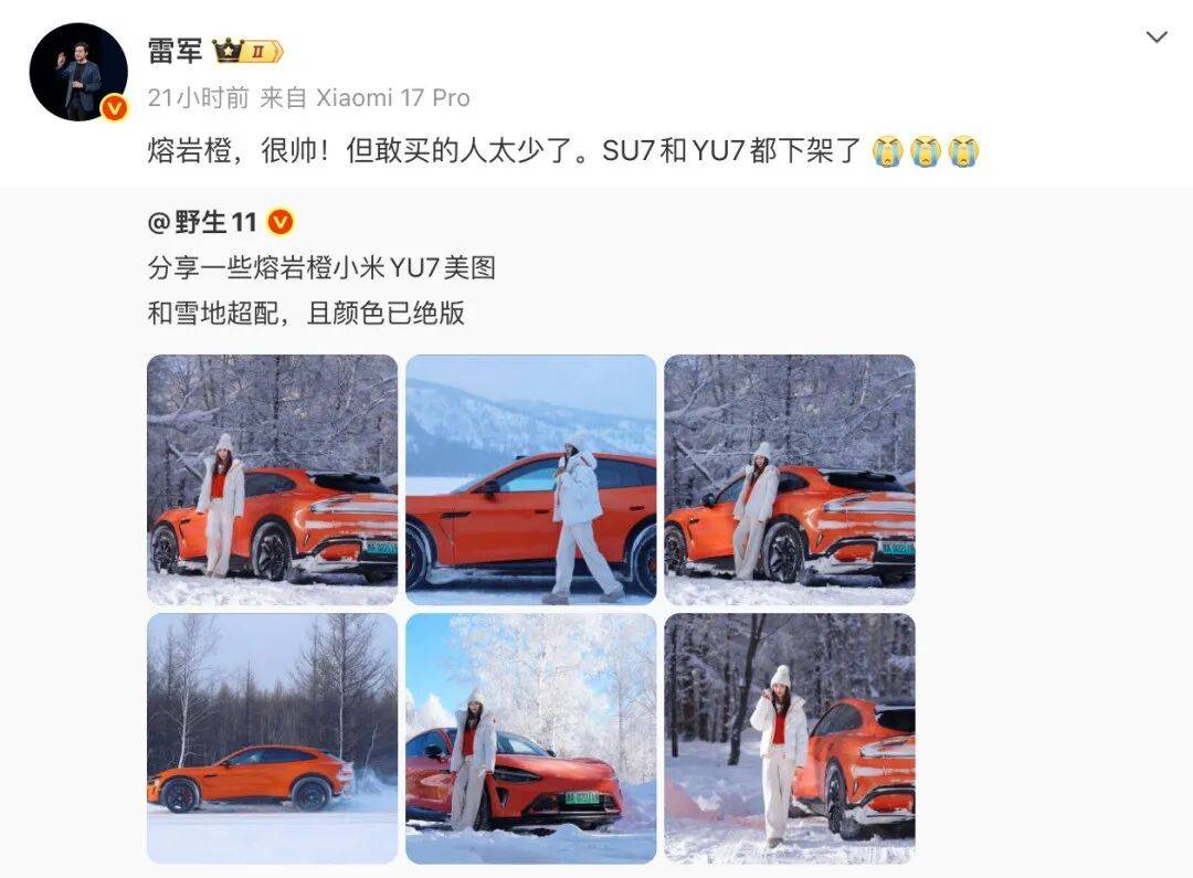 近日,小米汽車創(chuàng)始人雷軍在社交平臺(tái)發(fā)文透露,旗下SU7和YU7車型的熔巖橙配色已正式下架,并配以三個(gè)“流淚”表情,表達(dá)對(duì)這一獨(dú)特車漆的不舍。據(jù)官方信息,熔巖橙采用三層噴涂工藝,在陽(yáng)光下可呈現(xiàn)動(dòng)態(tài)光影效果,但因選裝率不足8%,遠(yuǎn)低于銀、綠等主流配色超60%的占比,最終退出市場(chǎng)。