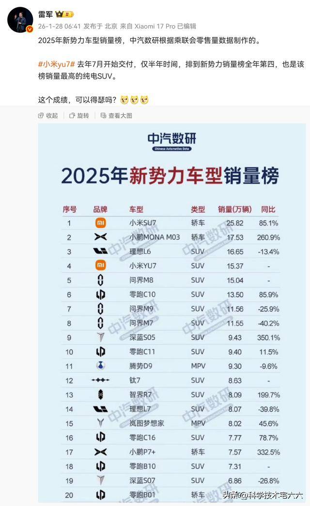 中汽數(shù)研近日發(fā)布的2025年新勢力車型銷量榜單顯示,小米YU7以全年15.37萬輛的成績位列第四,成為純電SUV細(xì)分市場銷量冠軍。這款去年6月底上市、7月開啟交付的車型,僅用半年時間便躋身新勢力銷量前列,展現(xiàn)出強勁的市場競爭力。