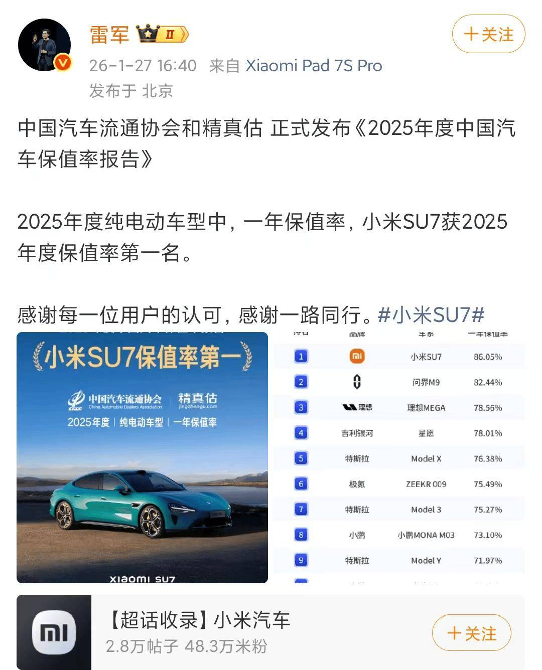 小米汽車近日迎來多項喜訊,旗下兩款主力車型在市場表現(xiàn)與行業(yè)認可方面均取得突破性進展。根據(jù)中國汽車流通協(xié)會聯(lián)合精真估發(fā)布的權威報告,小米SU7以優(yōu)異成績登頂2025年度純電動車型一年保值率榜首,這一成就標志著該車型在二手車市場價值保持能力上獲得專業(yè)機構背書。