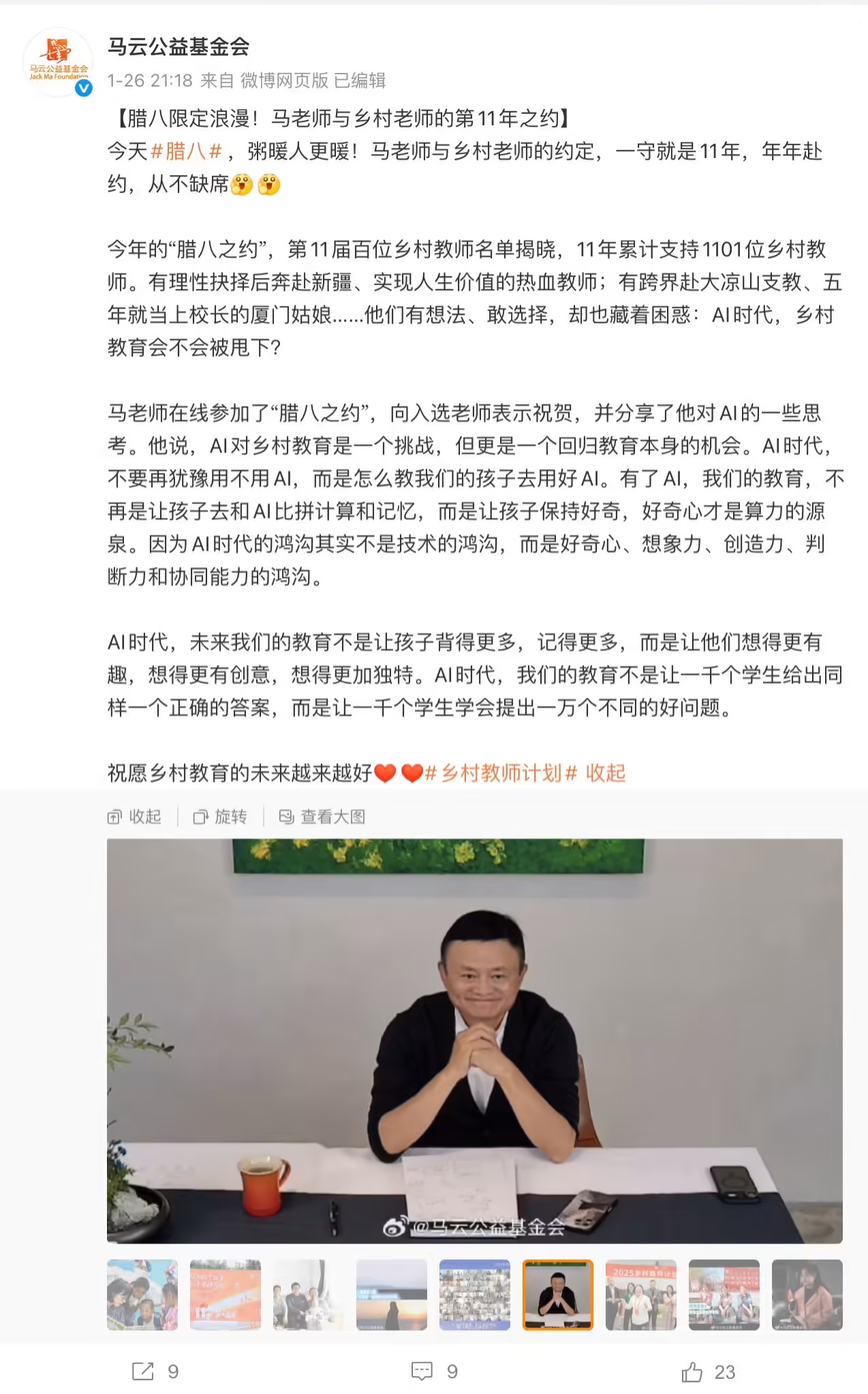 在近日一場以“臘八之約”為主題的活動(dòng)中,馬云公益基金會(huì)公眾號(hào)對外披露了馬云關(guān)于人工智能(AI)與教育融合的深度思考。這場活動(dòng)引發(fā)了社會(huì)各界對AI時(shí)代教育方向的熱議。