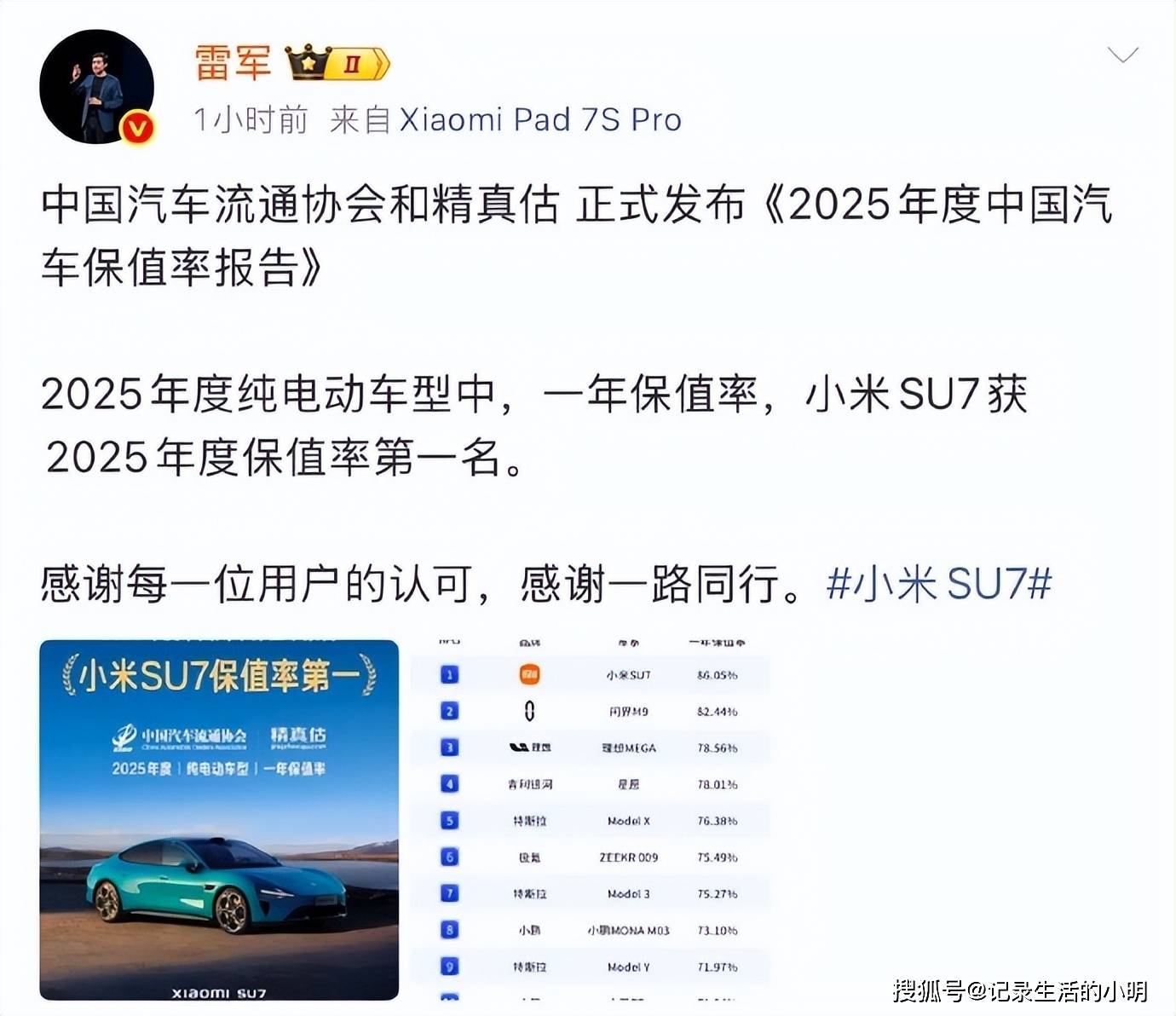 近日,中國(guó)汽車(chē)流通協(xié)會(huì)攜手精真估發(fā)布的《2025年度中國(guó)汽車(chē)保值率報(bào)告》引發(fā)廣泛關(guān)注,小米SU7憑借86.05%的一年保值率,在純電動(dòng)車(chē)領(lǐng)域脫穎而出,成功登頂榜首。這一消息迅速在汽車(chē)圈掀起熱議,小米集團(tuán)創(chuàng)始人雷軍也在第一時(shí)間通過(guò)微博向用戶(hù)表達(dá)感謝,足見(jiàn)這份成績(jī)對(duì)小米汽車(chē)的重要意義。
